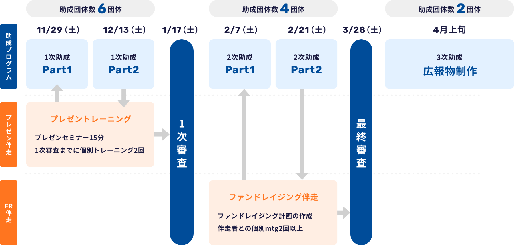 す。3段階のプログラムで、各段階のプレゼン審査を通過した団体が次の助成に進むことができます。